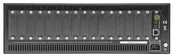 Este equipo ofrece 16 slots para tarjetas de entrada y salida, de los que 12 pueden utilizarse como entrada o salida y 4 como salida. Esto permite configurar todas las combinaciones de matrices desde 1×15 hasta 12×4.