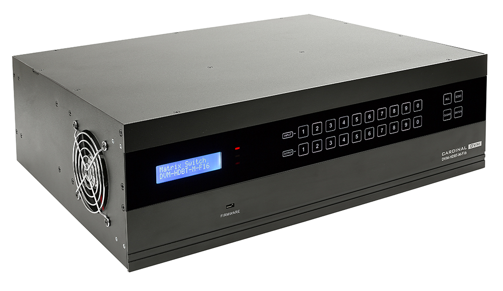 La matriz de señales 4K Cardinal DVM-HDBT-M-F16 de Sommer Cable permite realizar configuraciones flexibles de entradas y salidas.