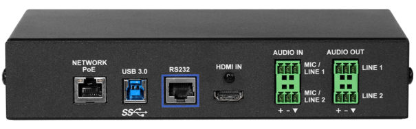 Su entrada HDMI acepta señales 4K (2160p / 30fps), y codifica y se escala de manera adecuada para generar una transmisión simultánea de USB 3.0 e IP con calidad de 1080p. Se integra con DSP externos al proporcionar dos entradas y salidas de línea de audio balanceadas.