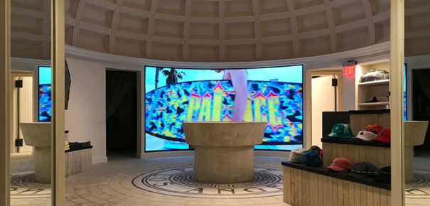 “El arquitecto de la nueva ubicación de Skateboard Palace en Los Ángeles nos encargó el diseño de una experiencia visual que abarcara a los clientes. El techo abovedado de la sala redonda era iudónea para el mapeo de proyección por el que somos conocidos, pero la pared curva requería una solución de una sola pieza, ya que no podíamos tener compradores caminando frente a un proyector. No habíamos trabajado con pantallas Led antes, pero como revendedor de Stampede, estábamos familiarizados con los productos de NanoLumens que llevan y nos dimos cuenta que su videowall Led curvo era la solución”.