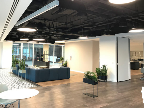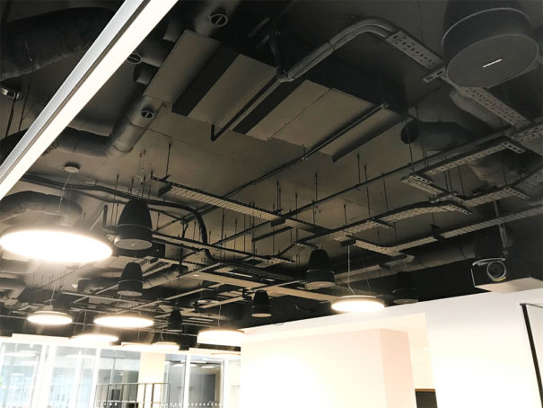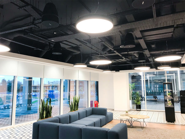 La empresa también necesitaba que el audio funcionara en múltiples zonas de grandes espacios multiusos/configurables y que tuviera un diseño moderno y atractivo que funcionara discretamente contra los techos en blanco y negro.