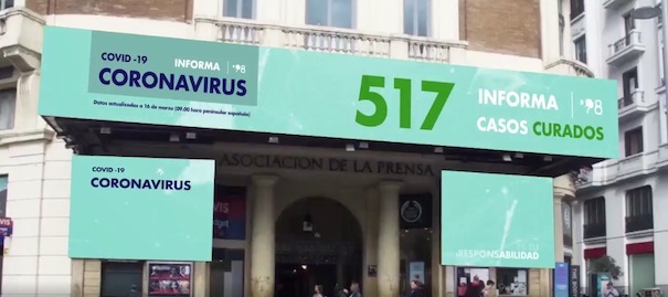 Las pantallas digitales de exterior (DooH) se han convertido en ‘balcones’ visuales y dinámicos en los que se muestran desde datos actualizados de los casos registrados por Covid-19, a mensajes con recomendaciones y de tranquilidad durante el actual  estado alarma, junto con emotivos agradecimientos a todos los sectores que estos días están en primera línea.