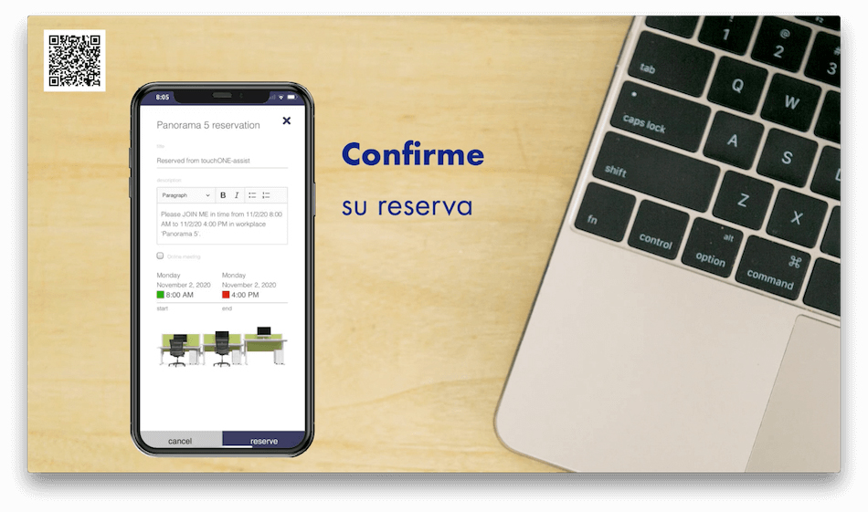 Para realizar reservas directamente en el sitio que se quiere ocupar, la plataforma ofrece reservas a través de código QR. Este se imprime y se instala en cada sala de juntas, puesto de trabajo, estacionamiento, mesa en comedor u otro recurso y sirve especialmente para dos funcionalidades: reservar el sitio escaneando el código QR directo desde el móvil o tablet y confirmar la ocupación del sitio (check-in). Sino se confirma la ocupación, la plataforma libera la reserva y deja el recurso disponible.