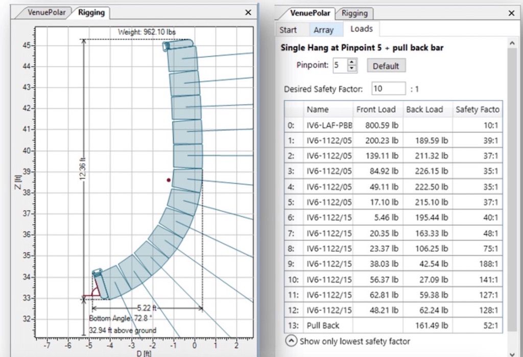 Besides, se han añadido nuevas capacidades a la Calculadora de seguridad de rigging, que se encuentra en la pestaña de Cargas. La barra de retroceso permite ahora a los diseñadores construir con seguridad arrays más grandes, de hasta veinte cajas, en prácticamente cualquier configuración.