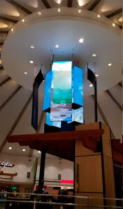 Los viajeros que pasan hoy por el aeropuerto internacional de Spokane se encuentran con un muro de bienvenida con ‘cubos de roca’, que parecen haber crecido de la propia arquitectura, y con una auténtica araña que cuelga de la cúspide de la Rotonda. Ambos elementos contienen más de una docena de superficies Led pero, a pesar de su complejidad, el equipo fue capaz de superar todos los obstáculos.
