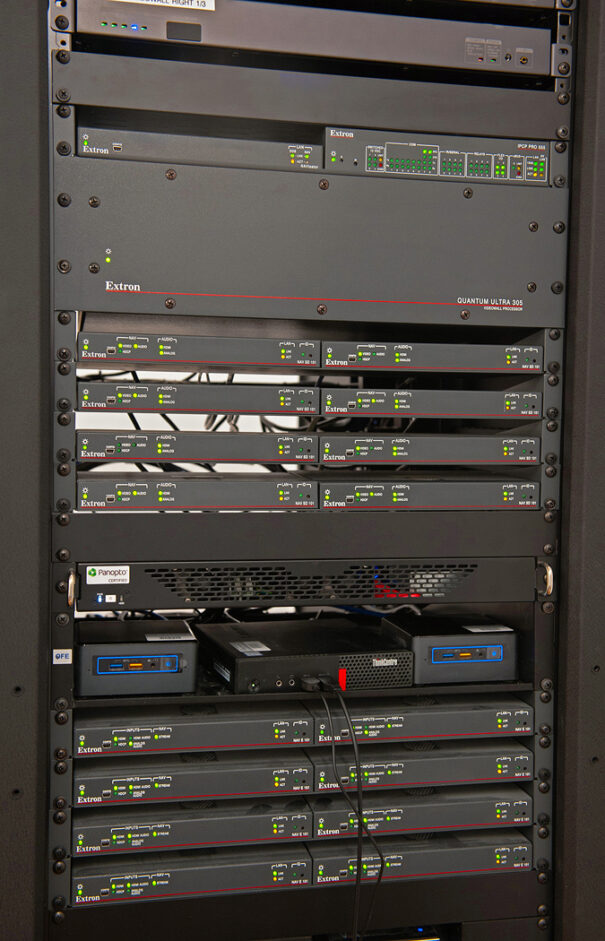 The Quantum Ultra video wall processor also provides signals to the two portrait orientation reference monitors facing the lectern and allows, during video conferences, show images of local content, shared and from remote participants simultaneously as three separate images.