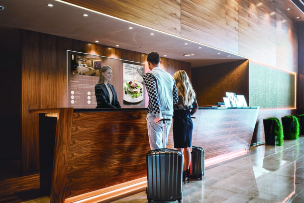 La zona de Recepción pone de relieve las posibilidades creativas de las pantallas OLED Transparent Signage de LG, al tiempo que muestra cómo las Ultra Stretch Displays de 88 pulgadas y la señalización anamórfica personalizada LG DVLed pueden ofrecer fondos informativos y atractivos.
