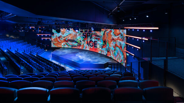 Todas las áreas de este versátil centro se apoyan en la tecnología de señalización digital, en la que destaca especialmente una gran pared Led 8K ubicada en el escenario de 58 m2 del estadio o arena, con capacidad para una audiencia en vivo de 550 personas.