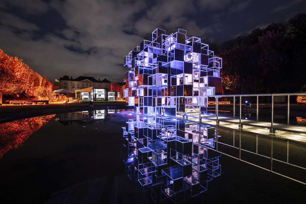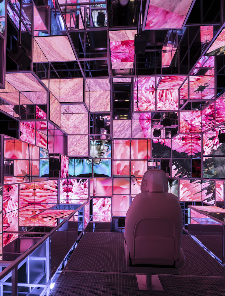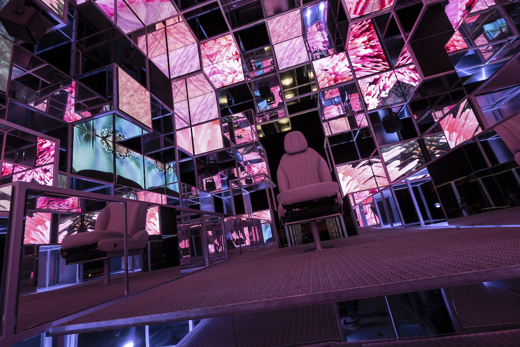 El ‘Garage mágico’ de Mercedes-Benz, realizado con cubos de superficies de espejos y pantallas y sonido Dolby Atmos sirve de muestra inmersiva que une las ferias de automóviles y de arte que se celebran del 16 al 23 October.