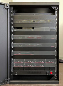 Ciertos componentes y fuentes del sistema AV están montados en el rack en un armario de equipamiento dentro de la sala o en una de almacenamiento adjunta. Las señales de fuentes montadas en el rack y los dispositivos de la sala o los conectados al atril y/o puestos se pueden enviar a cualquier combinación de dispositivos de visualización de una o más clases.