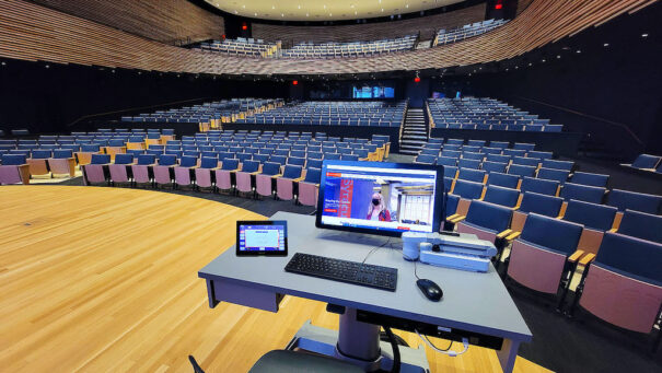 Cuando el auditorio funciona como una enorme aula universitaria, el instructor puede presentar y controlar el sistema utilizando una estación de enseñanza estándar de la universidad conectada a una de las cajas de suelo del escenario.