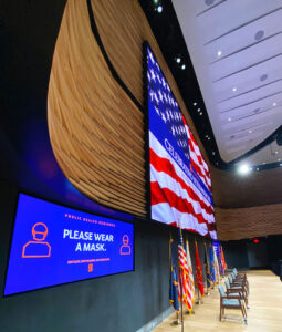 Para las personas con discapacidad auditiva, la instalación incorpora un Assisted listening system (ALS – sistema de ayuda auditiva) y da soporte al Communication access real-time translation (CART – traducción en tiempo real de acceso a comunicación). El sistema AV permite mostrar subtítulos en uno o en los dos videowalls más pequeños.