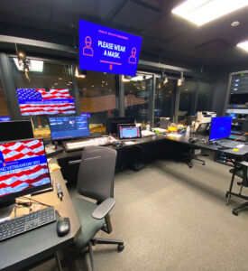 El dispositivo de visualización principal es un videowall de unos 9,7 metros de ancho, y a cuyos lados se disponen dos más pequeños como sistemas secundarios. Dentro de la sala han instalado ocho cámaras PTZ para su uso con aplicaciones de vídeo basadas en web, including Blackboard collaborate ultra y Zoom.