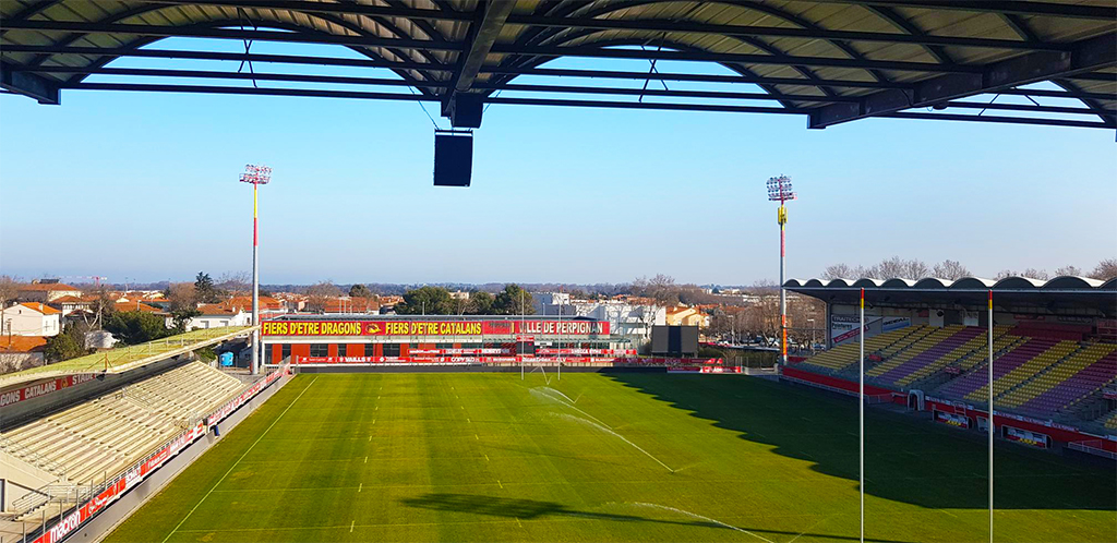 El estadio Gilbert Brutus en Perpignan, hogar del equipo de la liga francesa de rugby los Catalans Dragons, has 3 gradas y tiene capacidad para hasta unos 13.000 spectators. Este es el segundo estadio de la zona que apuesta por la tecnología de Nexo