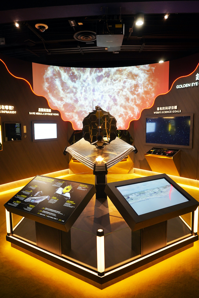 Golden eye on the Cosmos es la nueva exposición interactiva y permanente del Museo Espacial de Hong Kong en la que los visitantes pueden conocer la innovadora tecnología y los objetivos científicos del telescopio espacial James Webb, el mayor de infrarrojos del mundo.