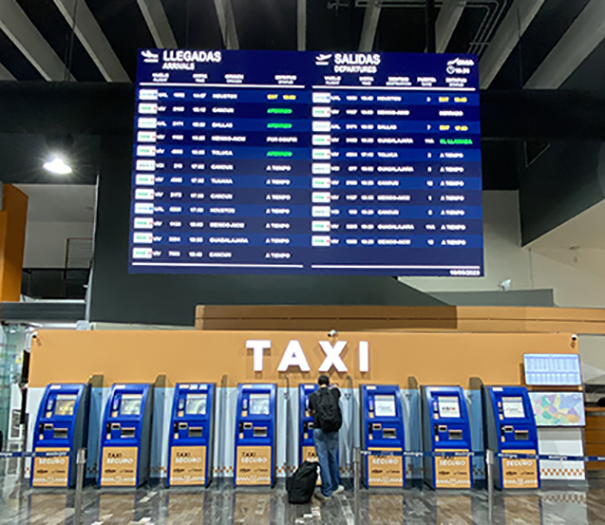 La primera fase del proyecto incluyó 18 instalaciones. En la zona de taxis se ha colocado un videowall de baldosas de 5,76×3,84 metros y en la entrada de la terminal del aeropuerto se han instalado dos soluciones adosadas al techo.