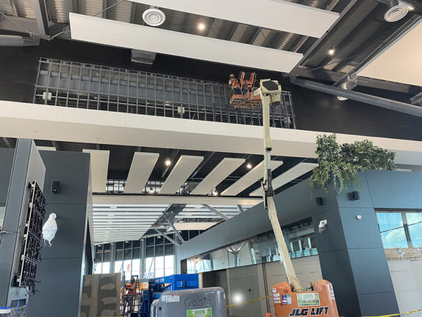 Muchas de las instalaciones se realizarían en altura, lo que supuso la puesta en marcha de planes de seguridad, que incluían estructuras de techo de acero meticulosamente diseñadas en las que se fijarían los soportes Peerless-AV.