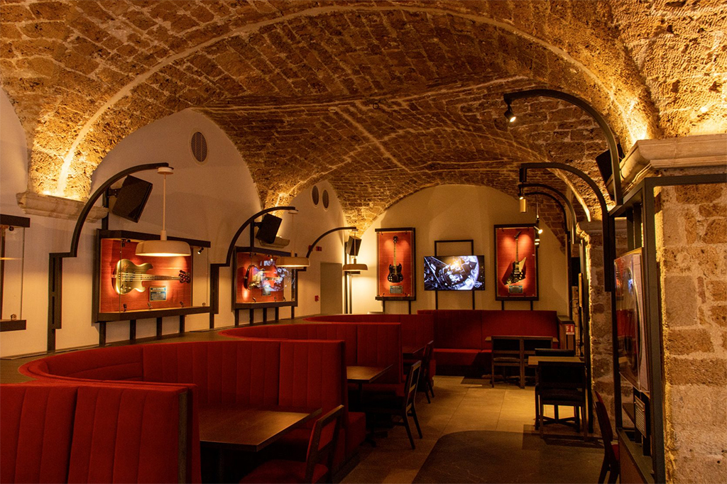 The interior is decorated with classic rock memorabilia, like guitars, costumes and photographs of famous musicians, creating an atmosphere that transports to the world of rock and roll.