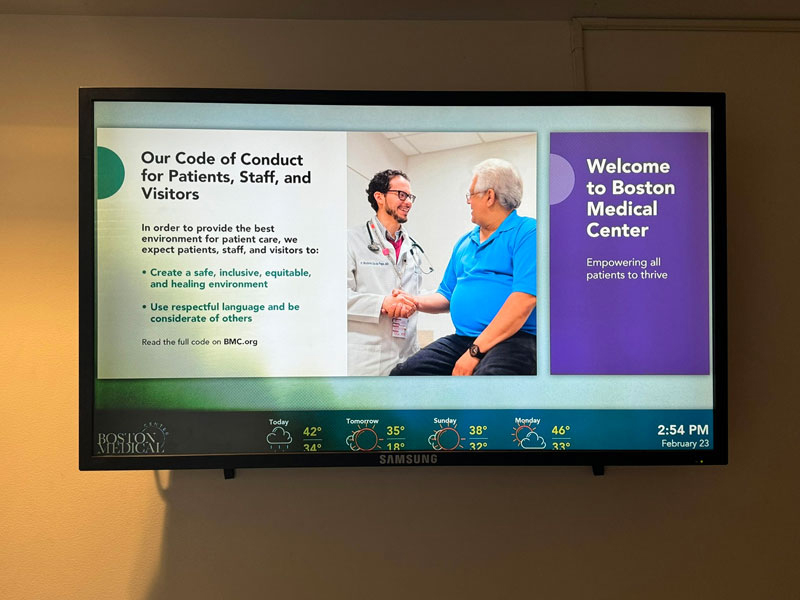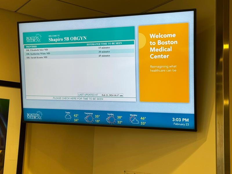 Visix ha desarrollado una aplicación para mantener a los visitantes informados sobre los tiempos de espera. La estrategia de Boston Medical Group incluye mezclar diapositivas sobre el tiempo de espera con coloridos anuncios de servicio público, diapositivas informativas y contenido que permite mantener las pantallas animadas y dinámicas.