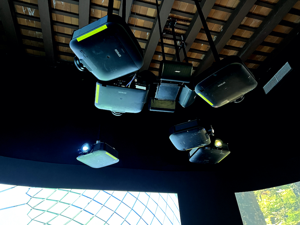 Para la sala inmersiva 360º se utilizan seis equipos de Epson para proyectar en paredes y techos, cada uno con una potencia of 8.000 lumens, junto a un completo sistema multizona con un audio envolvente from the manufacturer Bose Professional, compuesto por cuatro altavoces.