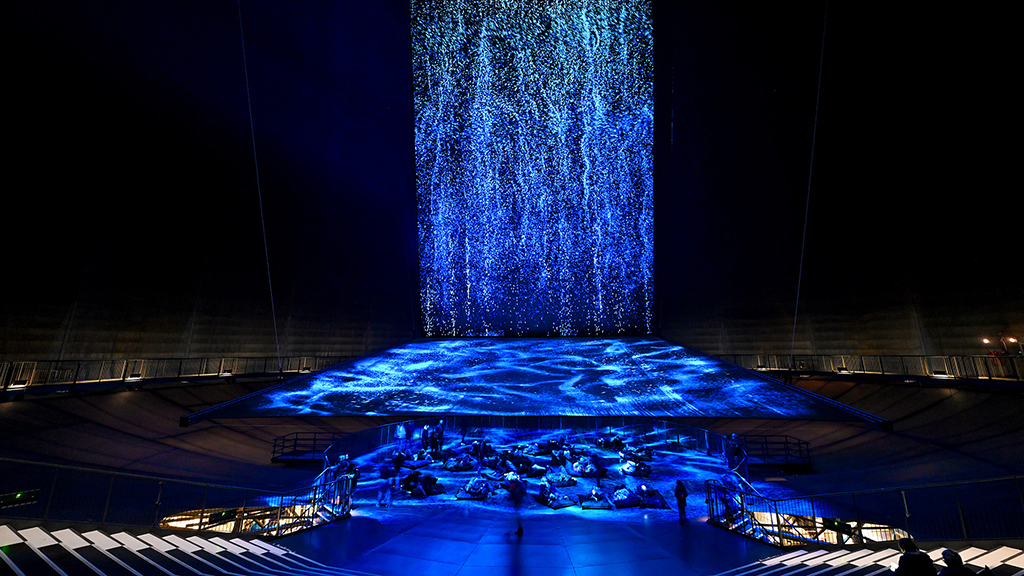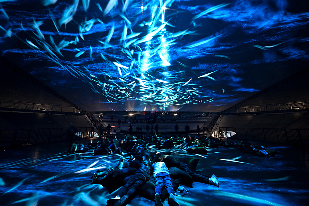 En la instalación Planet Ozean destaca la obra inmersiva a gran escala Die Welle, centrada en una pantalla de proyección Flex Contrast PRO de BY Stumpfl que se eleva 40 metros hacia el cielo desde la galería central.