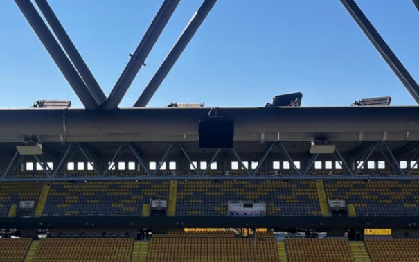 Los cabinets P+ se han instalado en pares en ángulos de 90 grados alrededor del estadio, uno enfocado hacia el campo y el otro hacia la multitud.