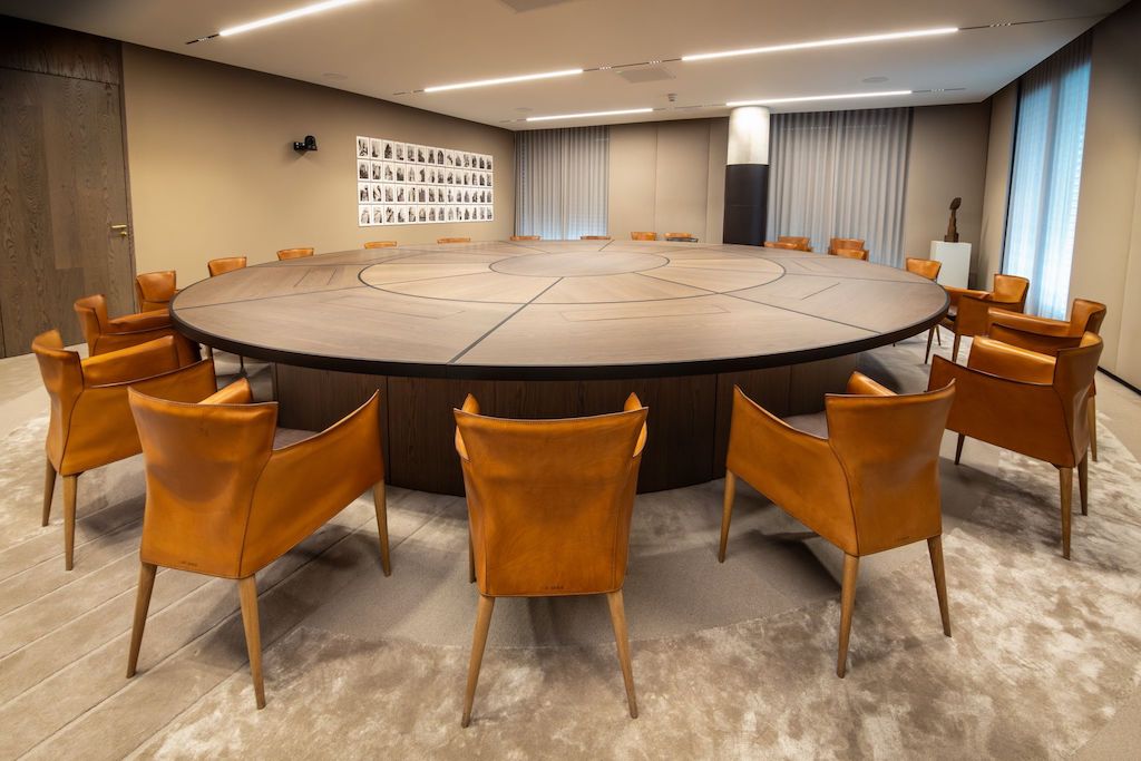 En el centro de la sala se ha dispuesto una gran y elegante mesa redonda de roble, que contribuye a un ambiente propicio para el debate y la toma de decisiones ejecutivas. Un conjunto de soluciones avanzadas AV y de conferencia se integran discretamente en este entorno tradicional.