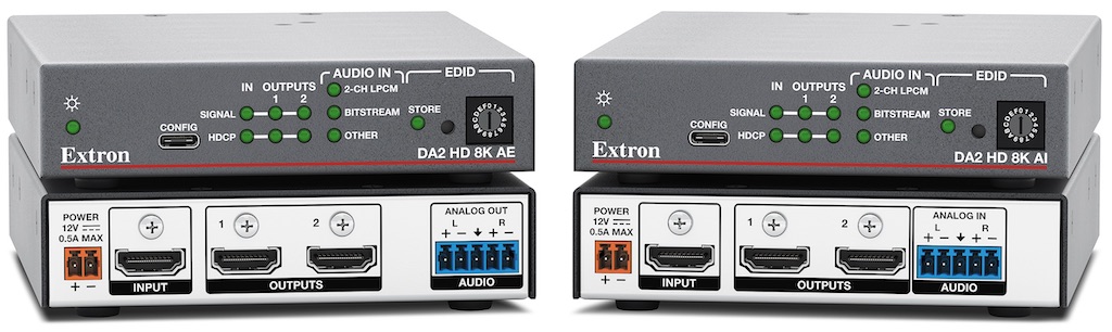Los models DA2 HD 8K AE and DA2 HD 8K AI, now available, are the latest additions to the range of 8K distribution amplifiers from Extron, both with two outputs to extract LPCM audio from the HDMI input signal and convert it to analog, with configuration for stereo or dual-mono signals.