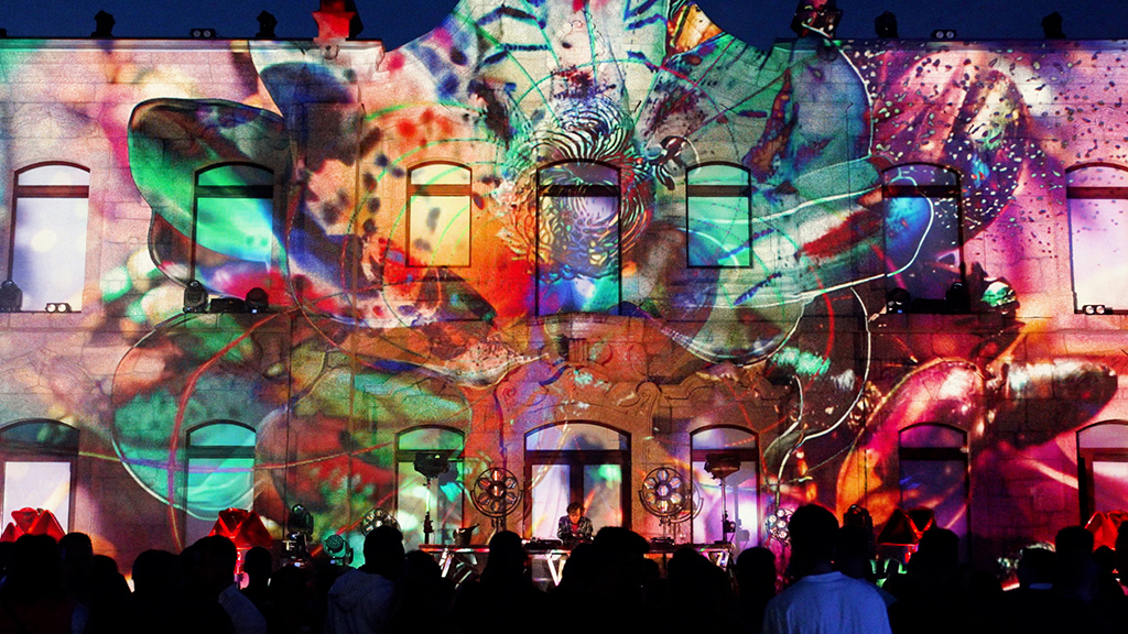A Christie M 4K25 RGB projector illuminated the façade and architecture of the venue, accompanying the live visuals of the artists Nuno Pereira, Carlotta Premazzi, Daniel Shirt (VJ Dataset) y Mechanical Astronaut.
