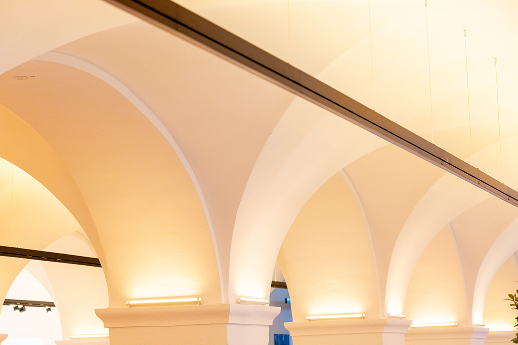 El punto de inflexión llegó durante la planificación del diseño de iluminación de la planta baja. El arquitecto imaginó un eje de iluminación largo y lineal que recorría el espacio de forma limpia, acentuando la geometría de las bóvedas históricas y atrayendo a los visitantes desde la entrada. Pero esta visión también planteó otra pregunta: cómo distribuir uniformemente un audio de alta calidad sin interrumpir el diseño interior. Montar altavoces tradicionales en las paredes no era una opción.