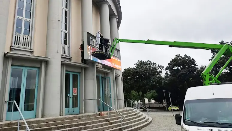 Screen installation at the Saarländisches Staatstheater, protected building, raised several challenges. A key requirement was to design a self-supporting substructure that could be safely mounted on the theater façade without causing any damage. Besides, since the Tblisser Platz, Located right in front of the main entrance, hosts large festival stages throughout the summer, heavy machinery could not be counted on.