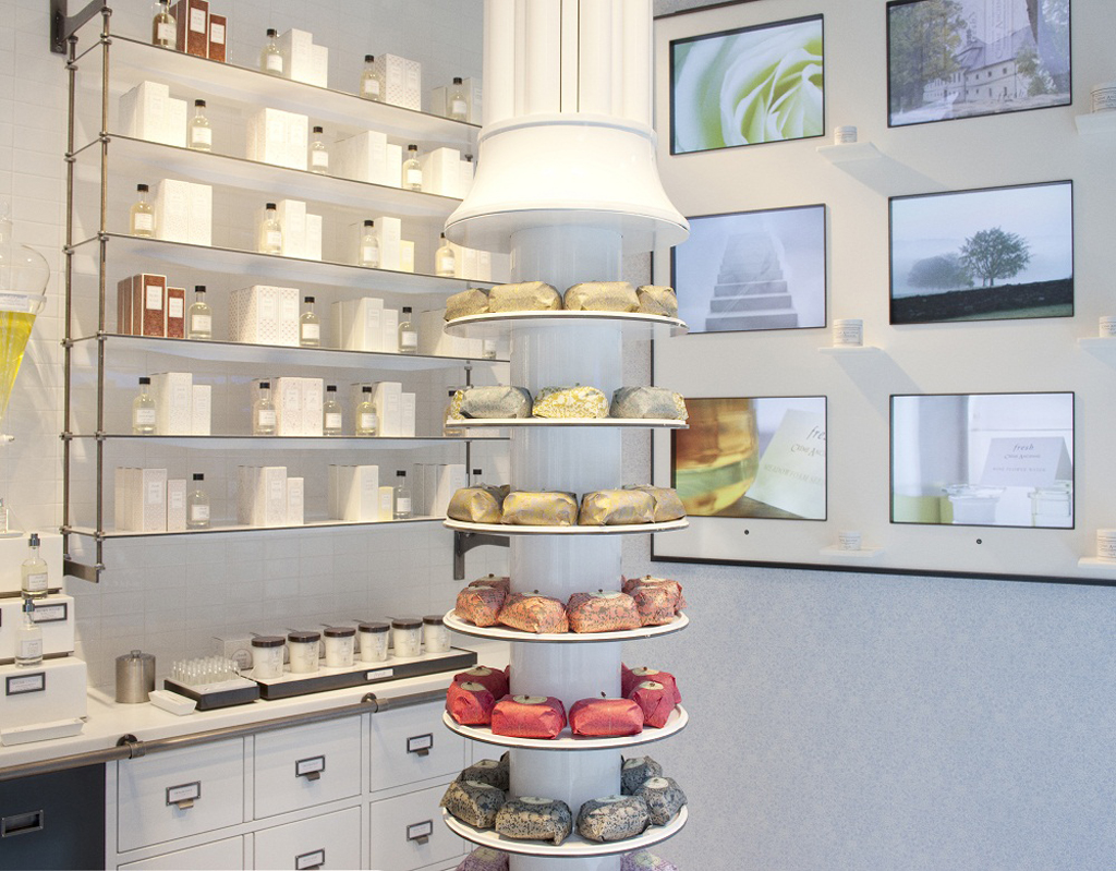 L'installation, Travail des matériaux & Méthodes, a eu l'expérience technique de Christie et suit les conceptions originales du studio d'architecture Mapos LLC. L'espace innovant de Fresh intègre harmonieusement la technologie moderne Christie MicroTiles avec des pièces originales authentiques du « vieux monde »., comme une lampe lustre personnalisé, murs tapissés avec des designs exclusifs et un « bar sensoriel »’ avec des « robinets »’ de parfums abandonnés afin que les clients puissent remplir de petits flacons faits à la main avec leurs parfums préférés. Ces environnements de magasin uniques et innovants sont entourés de matériaux écologiques et d'un éclairage LED à haute efficacité énergétique..