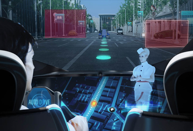 El interior también puede funcionar como área de visualización y se puede modificar a voluntad. Tanto el contenido, como la información de navegación se unen perfectamente con el interior, grâce à la technologie de réalité augmentée. También existe un asistente de navegación que aporta información a los pasajeros sobre aspectos de la conducción.