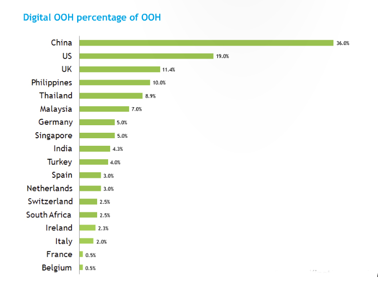 El documento cuantifica que el Digital Out-of-Home representa actualmente un 7% de todas las inversiones OOH a nivel mundial y que China y los EE.UU. son los principales mercados, con unos ingresos, respectivement, de 2.730 y más de 1.100 millions de dollars, seguidos de Reino Unido (157 millones), Allemagne (51 millones), Tailandia (24,3 millones), France (alrededor de 20 millones -en el informe aparece una cifra mucho menor por error-) y España (16,8 millions de dollars).