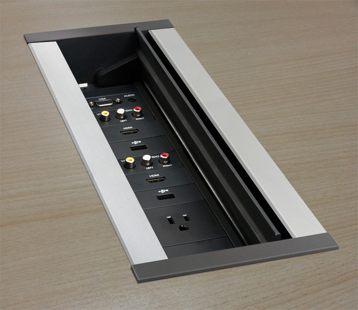 También está disponible una selección de módulos de potencia, adaptados a las normas reglamentarias de una gran variedad de países. El HydraPort queda casi al ras de la superficie donde se ha montado, como una mesa o atril, incluso con la tapa levantada, lo que lo hace ideal para mantener limpio el escaso espacio disponible en un atril o mesa de reuniones. Los usuarios pueden conectar y controlar ordenadores portátiles, projecteurs, caméras de documents, reproductores de DVD, equipos de audio y otros dispositivos de apoyo a la presentación. La tapa se abre en ambas direcciones ofreciendo un aspecto limpio y discreto, y se puede cerrar incluso con la mayoría de los cables conectados.