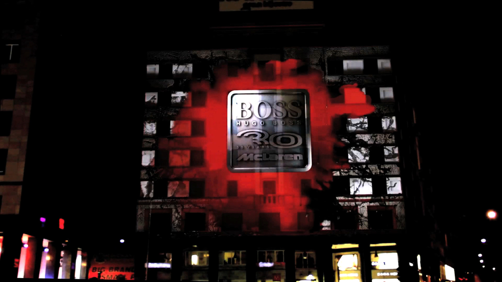 La milanesa Piazza San Babila fue el lienzo de un espectacular show encargado por Hugo Boss para celebrar sus 30 años de asociación con McLaren Formula 1 y la apertura de su renovada tienda en Milán. Para conmemorar el acontecimiento, se encomendó a la agencia de comunicación ‘Say What’ la tarea de poner en pie unos innovadores gráficos en movimiento. La agencia contrató los servicios de Angel Studios, que a su vez recurrieron a Roberto Fazio, un artista audiovisual del 3D mapping, para que creara un filme de impacto.