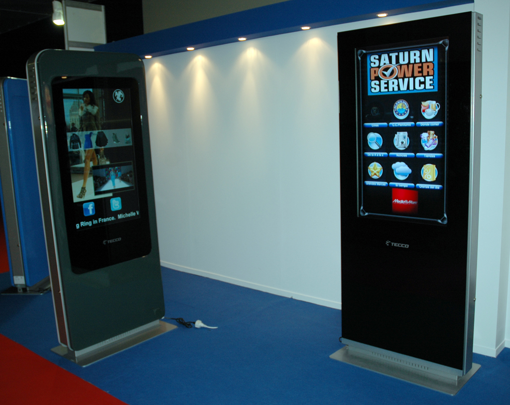Tecco ha mostrado este año en ISE 2012 varias versiones de su familia de tótems, entre los que se incluyen los modelos de poliéster en diferentes colores y en versiones de una o doble cara y el modelo en aluminio y con pantalla interactiva.