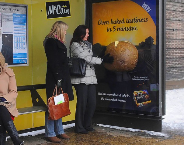 JCDecaux ha recurrido a una acción de marketing sensorial muy sorprendente para promocionar las nuevas patatas asadas para microondas de la marca McCain, utilizando paradas de autobús con una patata gigante que, al apretar un botón, se calienta y lanza aroma a patatas asadas.
