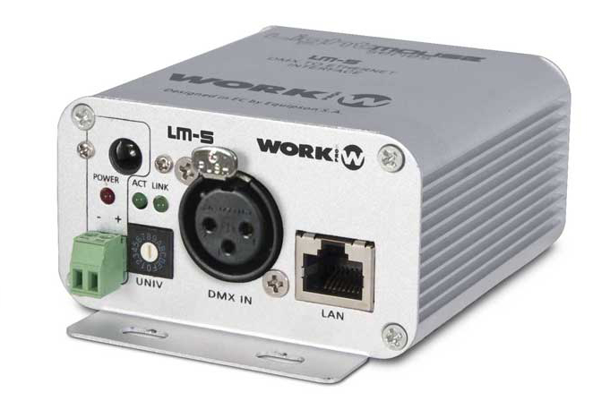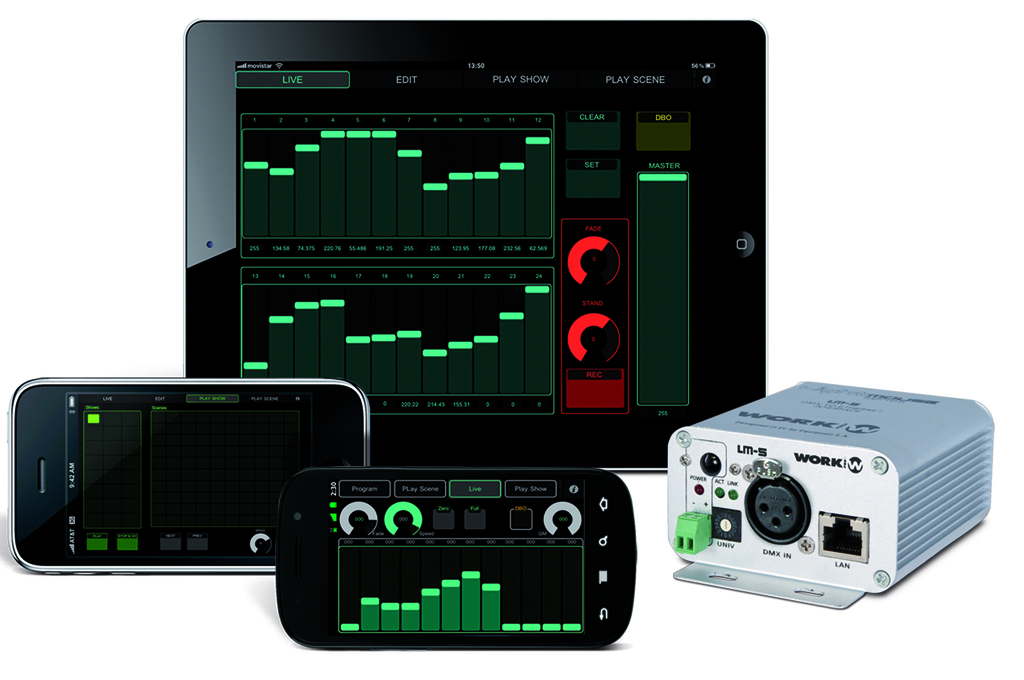 WORK ha lanzado una nueva consola DMX que consiste en un nodo ARTNET2 al que se le ha añadido memoria para almacenar Cues de 512 canales y Cue-list (jusqu'à 24). El producto se llama LightMouse 5 (LM-5) y permite controlar, programar y ejecutar DMX utilizando OSC (Ouvrir le contrôle du son) por lo que con aplicaciones como TouchOSC (iPhone, iPad, Androïde) es posible crear Layouts personalizados para cada usuario.