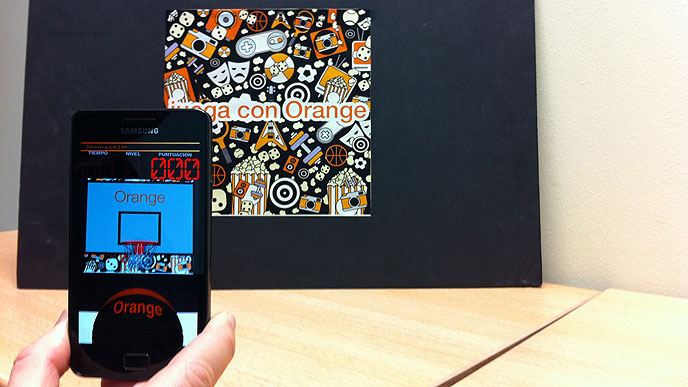 En ce sens, Orange y la ACB también han desarrollado Encesta, un juego basado en realidad aumentada que permite simular la experiencia de tirar a canasta desde el móvil. El juego utiliza una interfaz de realidad aumentada que permite superponer, sobre la imagen “juega con Orange” captada por la cámara de móvil, un tablero virtual. Si el usuario se acerca, se aleja o se mueve alrededor de la imagen, la posición del tablero se ajustará debidamente, como si fuera un tablero real.