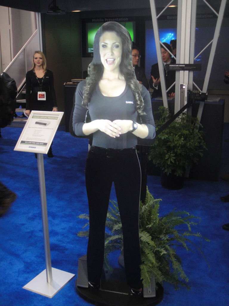 Con un proyector láser y un poco de imaginación, Casio ha montado en la DSE una llamativa atracción, el Presentador Virtual, que combina un proyector con una pantalla 3M diseñada especialmente que se ha recortado para parecerse a un presentador en directo. Par conséquent, una bella y realista presentadora virtual cautiva a los visitantes al hablar y participar como lo haría una presentadora de carne y hueso. Si la producción está bien calculada el efecto es casi como tener una persona haciendo la demostración (o informando, o dando la bienvenida, o lo que sea).