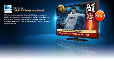 DIRECTV Message Board est un outil d'affichage numérique passionnant qui permet aux entreprises de superposer des messages promotionnels sur la programmation en direct DIRECTV qu'elles diffusent dans leur établissement.. Le produit permet aux chefs d'entreprise d'améliorer le service et d'augmenter les ventes de produits tout en divertissant les consommateurs avec une télévision par satellite haut de gamme..