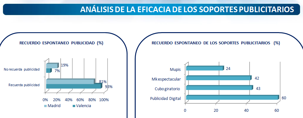 Sur le total des utilisateurs de ce média, et 87% des répondants (81% à Madrid et 93% à Valence), se souvient spontanément d'avoir vu de la publicité dans les gares. En plus, de tous les supports auxquels ils sont exposés, Les médias numériques sont les médias dont on se souvient le plus parmi les personnes interrogées, atteindre des pourcentages de 75%. Concernant le souvenir publicitaire proposé, los soportes de Publicidad Digital Dinámica alcanzan cifras del 94% à Valence et le 86% à Madrid , et les personnes interrogées s'accordent à dire que les médias numériques sont les plus adaptés à la publicité..