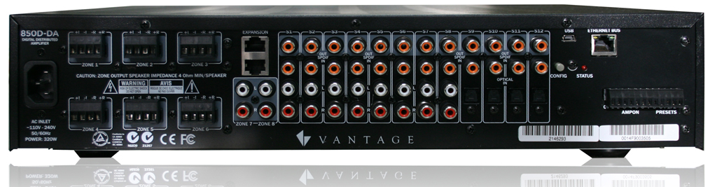 El proveedor de sistemas de control de audio, iluminación y home theater para el hogar, Vantage, ha lanzado el amplificador de audio digital distribuido 850D-DA, dedicado a la distribución de sonido multi-room. Cada 850D-DA posee control de volumen independiente o vinculado para cada una de las ocho zonas amplificadas/ pre-amplificadas, y acepta cualquier fuente analógica o digital.