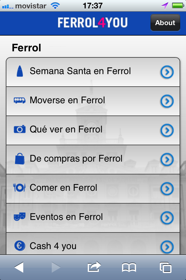 El proyecto Ferrol4you consiste en una aplicación móvil que cuenta con una sección informativa en la cual los usuarios podrán ver el calendario de actividades de Semana Santa en Ferrol, información sobre el transporte público y los diferentes puntos de interés de la ciudad. De cette façon, la aplicación servirá como un guía turístico digital para las personas que visitan Ferrol.