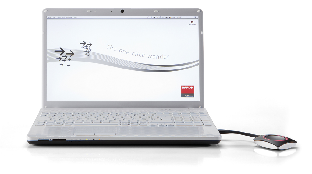 Un equipo ClickShare estándar se compone de cuatro dispositivos USB (los “Botones ClickShare”), una cesta de almacenamiento (le “Bandeja ClickShare”) para almacenar cuidadosamente los botones cuando no están en uso y una Unidad Base. La Unidad Base tiene una conexión fija al sistema AV de la sala de reuniones y se encarga de todo el proceso. Los usuarios que quieran poner su presentación en la gran pantalla de la sala de reuniones sólo tienen que conectar un Botón a su PC o Mac, hacer click en él … y de inmediato su escritorio se transfiere de forma inalámbrica al sistema de visualización de gran tamaño. Es más, ClickShare no interfiere con la resolución del portátil, y automáticamente se muestra el contenido en la pantalla de manera óptima. ClickShare también permite ver clips de video con velocidades de cuadro de hasta 20 fps.