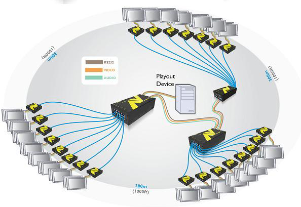 Selon Intronique, esta inversión en infraestructura audiovisual puede ser mucho más efectiva si se reubica el monitor, llevándolo a la zona de acceso a la tienda; colocando múltiples pantallas distribuidas en la tienda, repitiendo en todas ellas el mensaje a lo largo del recorrido de compras del cliente. Néanmoins, colocar el ordenador en la zona de acceso no es una decisión práctica, no solo por seguridad sino por incomodidad. Si se utilizan muchas pantallas, cada una de ellas necesitaría un propio ordenador, lo que eleva no solo el monto de la inversión sino también los costes de gestión y mantenimiento. Intronics apunta que la solución más adecuada será que el cable VGA original sea reemplazado por una infraestructura que distribuya la señal de un solo ordenador hacia todos los monitores a la vez, lo que se logra con los AdderLink AV200.