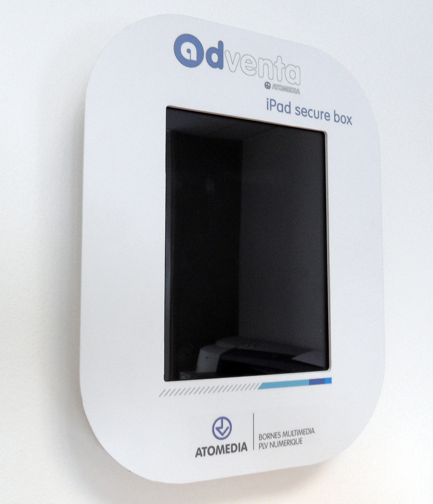 Atomedia ha desarrollado una caja de pared segura y compatible para alojar cualquier tablet (iPad, Androïde, etc.) con el objetivo de poder usarlos en sitios públicos (hôtels, magasins, etc.).