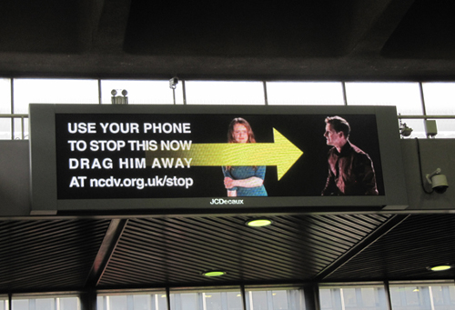 El Centro Nacional de Violencia Doméstica (NCDV) de Reino Unido ha puesto en marcha una campaña publicitaria interactiva en la estación Euston del metro de Londres para concienciar al público sobre cómo las personas pueden intervenir para ayudar a poner fin al maltrato. La campaña se ha mostrado en pantallas e-motion de gran formato de JCDecaux y alentaba a los transeúntes a participar en el anuncio mediante el control de la escena con su teléfono móvil.
