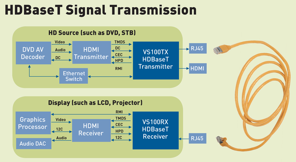 La tecnología HDBaseT es una tecnología de conectividad optimizada para la distribución multimedia comercial y doméstica. HDBaseT puede conectar todos los dispositivos de entretenimiento en un entorno a través de su conjunto de características 5Play, convergiendo vídeo digital full HD sin comprimir, audio, Ethernet 100BaseT, Power over HDBaseT (POH) y varias señales de control a través de un solo cable CAT5e /6 100m/328ft con conectores RJ45.
